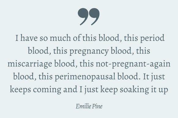 “Famously, the trick to good writing is bleeding onto the page. I picture the male writer who coined this phrase, sitting at his typewriter, the blank sheet before him. What kind of blood did he imagine? Blood from a vein in his arm? Or a leg? Perhaps a head wound? Presumably it was not blood from a cervix. I have so much of this blood, this period blood, this pregnancy blood, this miscarriage blood, this not-pregnant-again blood, this perimenopausal blood. It just keeps coming and I just keep soaking it up. Stuffing bleached cotton into my vagina to stem the flow, padding my underwear, sticking on the night pads ‘with wings’, hoping not to leak on some man’s sheets, or rip off too much pubic hair with the extra-secure adhesive strips. Covering up with ‘period pants’, those unloved dingy underwear choices pulled out from the bank of the drawer every month. And all along, I was wrong. I should have been sitting down at my desk and spilling it across the page, a shocking red to fill the white.”